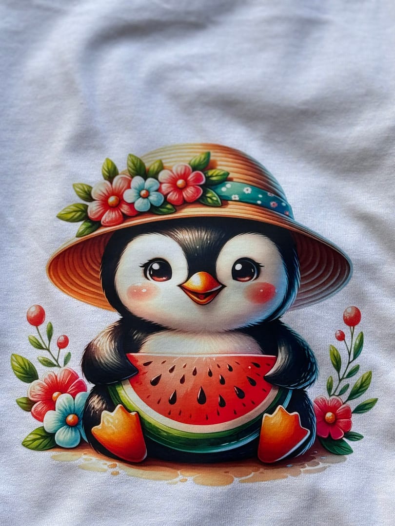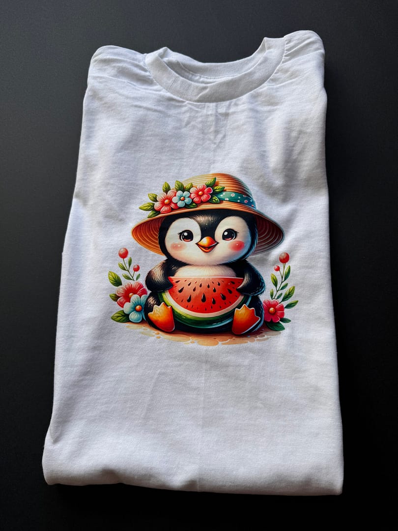 Embrace cuteness, comfort, and a touch of sparkle with our Adorable Watermelon Penguin Floral T-Shirt, available in two delightful versions. This charming design features an adorable penguin wearing a straw hat adorned with vibrant flowers, holding a juicy watermelon slice. You can choose between the regular print for a classic look or opt for the glitter film version, which adds a subtle shimmer for extra whimsy.