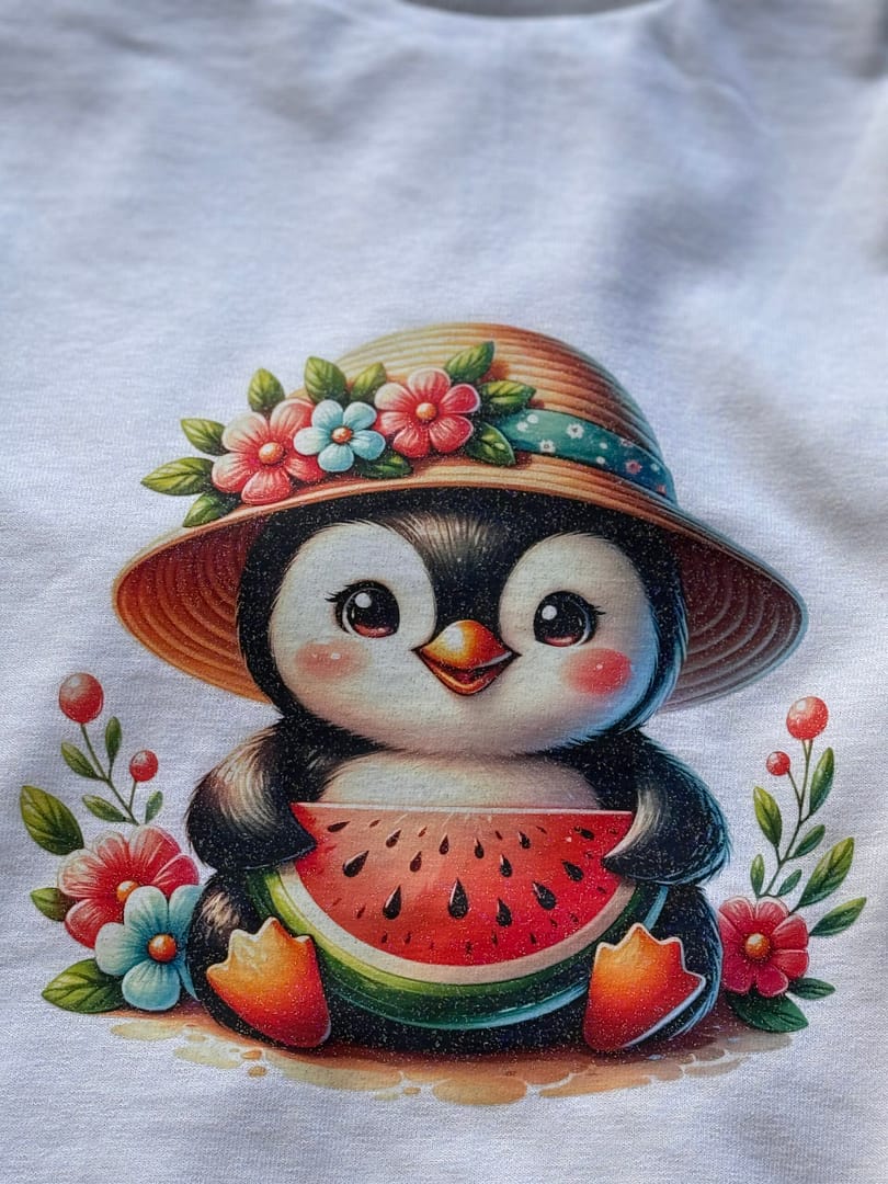 - Design: Adorable penguin with watermelon and floral accents, with a glitter film option for a touch of sparkle