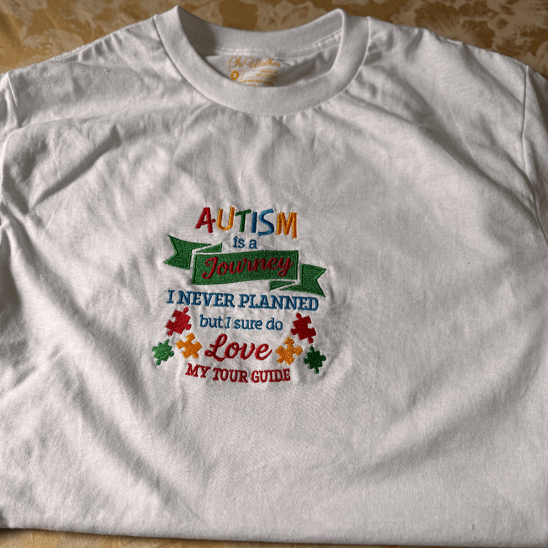 Each shirt is machine-embroidered with care and finished with colorful puzzle pieces—symbols of the richness and diversity within the autism community.
