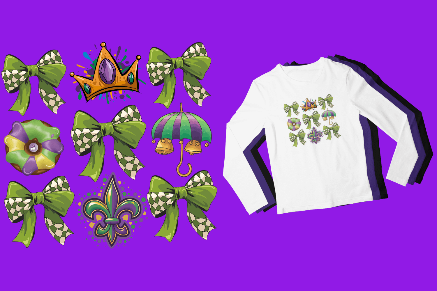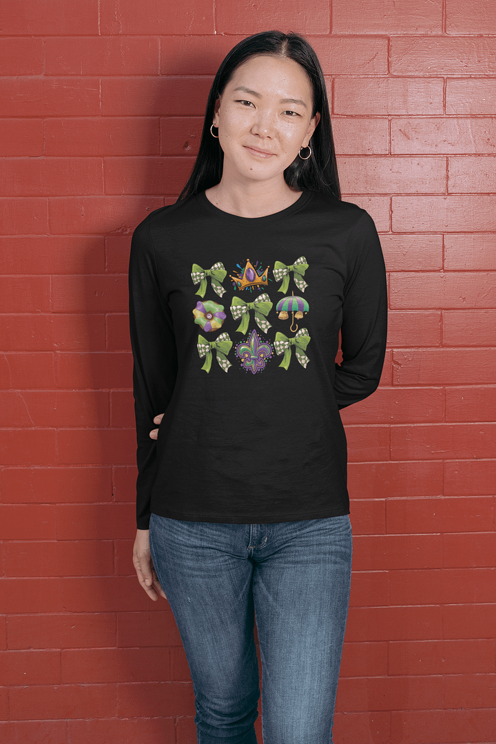 Stay cozy and festive this Mardi Gras season with the Bayou Carnival Charm Grid long sleeve shirt. Featuring a mix of iconic Mardi Gras elements like checkered bows, a crown, and a fleur-de-lis, this shirt is perfect for cooler parade nights or casual celebrations.