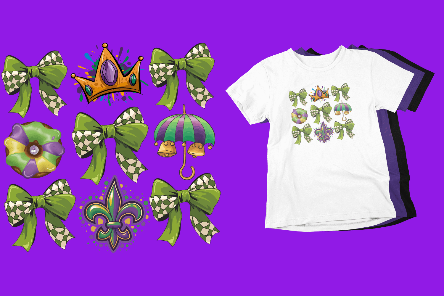Celebrate the joy of Mardi Gras with this Bayou Carnival Charm Grid t-shirt! Featuring a charming mix of checkered bows, a crown, a fleur-de-lis, and a king cake in vibrant Mardi Gras colors, this design is perfect for parades, parties, or showcasing your festive spirit.