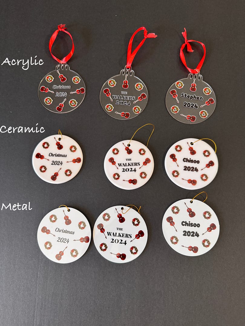Bring music and joy to your Christmas tree with the Customizable Holiday Harmony Bass Ornament! Featuring elegant upright basses framed by festive wreaths, these ornaments are available in metal or acrylic (3″ in diameter) and ceramic (2.75″ in diameter). Add a personalized name for $4 more. If no name is provided, Option 1 (“Christmas”) will be used as the default. If providing a name, please specify whether you’d like Option 2 or Option 3. Perfect for musicians and music lovers!