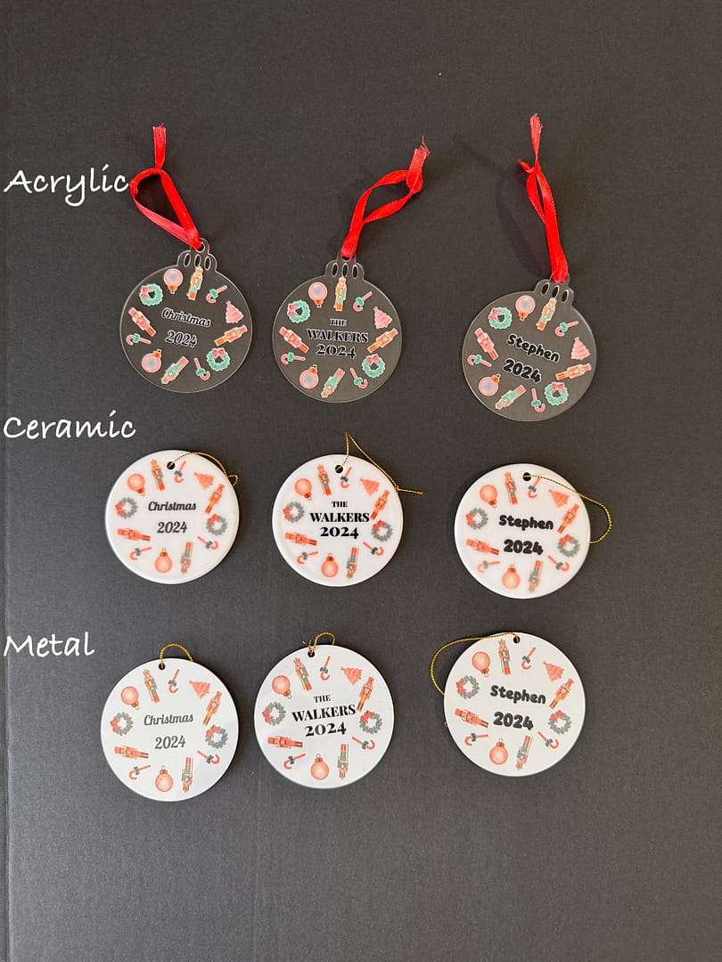 Make your holiday decor truly special with the Customizable Sugarplum Nutcracker Christmas Ornament! Featuring the whimsical pink and mint nutcracker design, these ornaments are available in durable metal or lightweight acrylic (3″ in diameter) and elegant ceramic (2.75″ in diameter). Add a personal touch by customizing the text with a name for just $4 more. If no name is provided, Option 1 (“Christmas”) will be used as the default. If providing a name, please specify whether you’d like Option 2 or Option 3. A perfect keepsake or holiday gift!