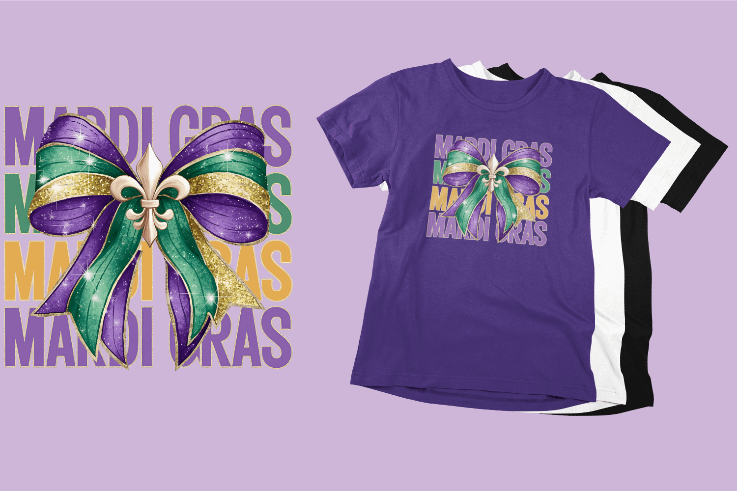 Shine bright this Mardi Gras with this stunning Glitter Glam Fleur Bow t-shirt! Featuring a dazzling design with vibrant purple, green, and gold accents, this shirt is perfect for parades, parties, and all your festive celebrations.