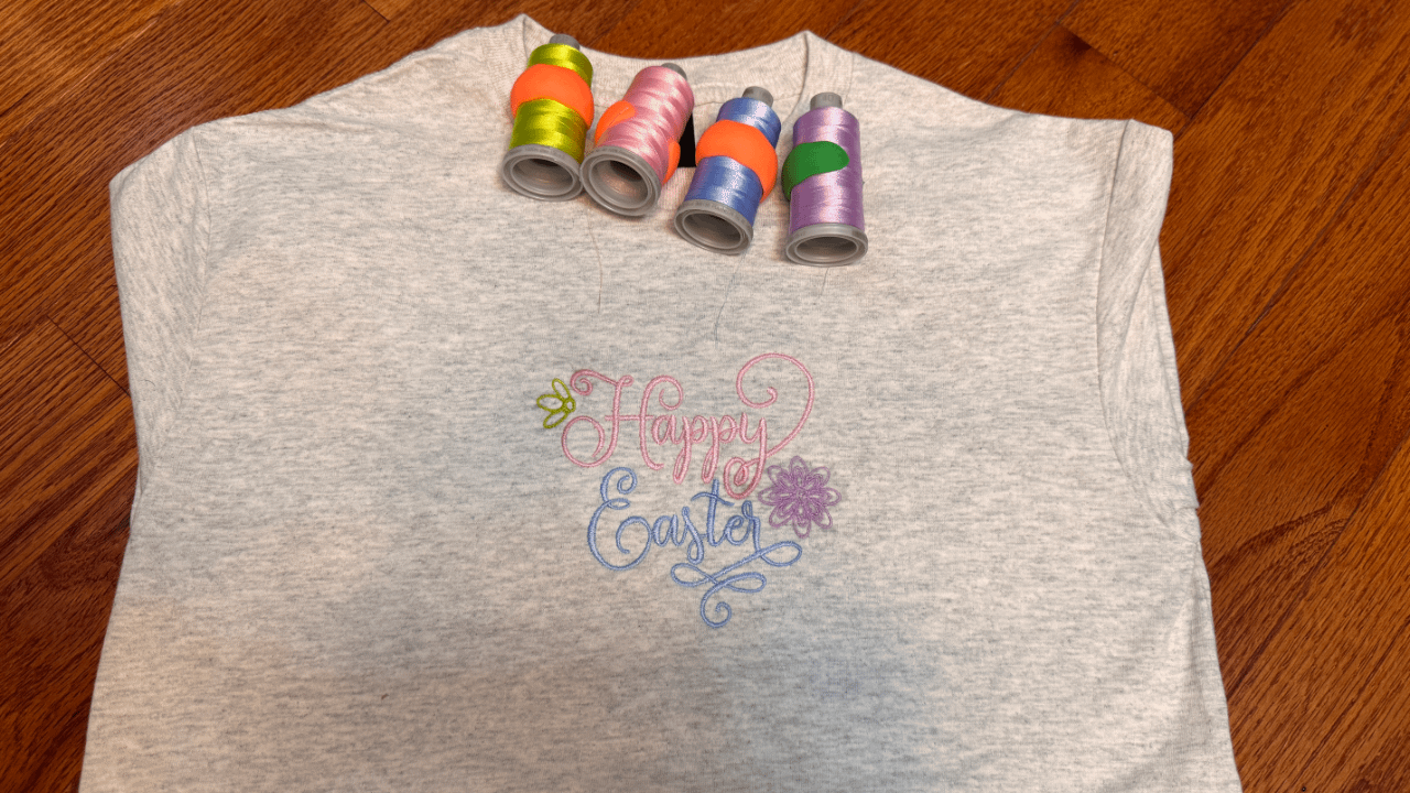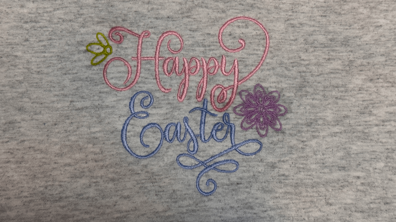 Celebrate the joy of Easter with this cheerful embroidered t-shirt! The “Happy Easter” design features soft spring colors on a classic ash grey Gildan Heavy Cotton tee.