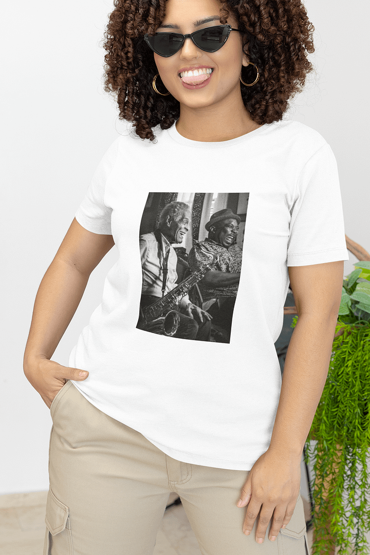 Celebrate the rich heritage of New Orleans jazz with this exclusive t-shirt featuring legendary musicians Charlie Gabriel and Kevin Louis. Captured in a candid moment of musical joy, this black and white photograph immortalizes two of jazz’s most iconic figures. Printed on a soft and durable cotton blend, this t-shirt offers comfort and style, making it a must-have for any jazz enthusiast.