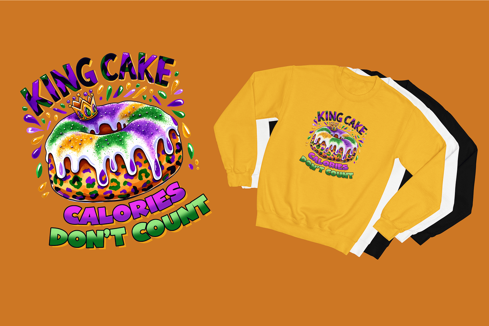 Cozy up this Mardi Gras with the Leopard King Cake “Calories Don’t Count” sweatshirt! This design combines festive colors, a leopard-patterned King Cake, and humor, making it perfect for parades, gatherings, or lounging in comfort.