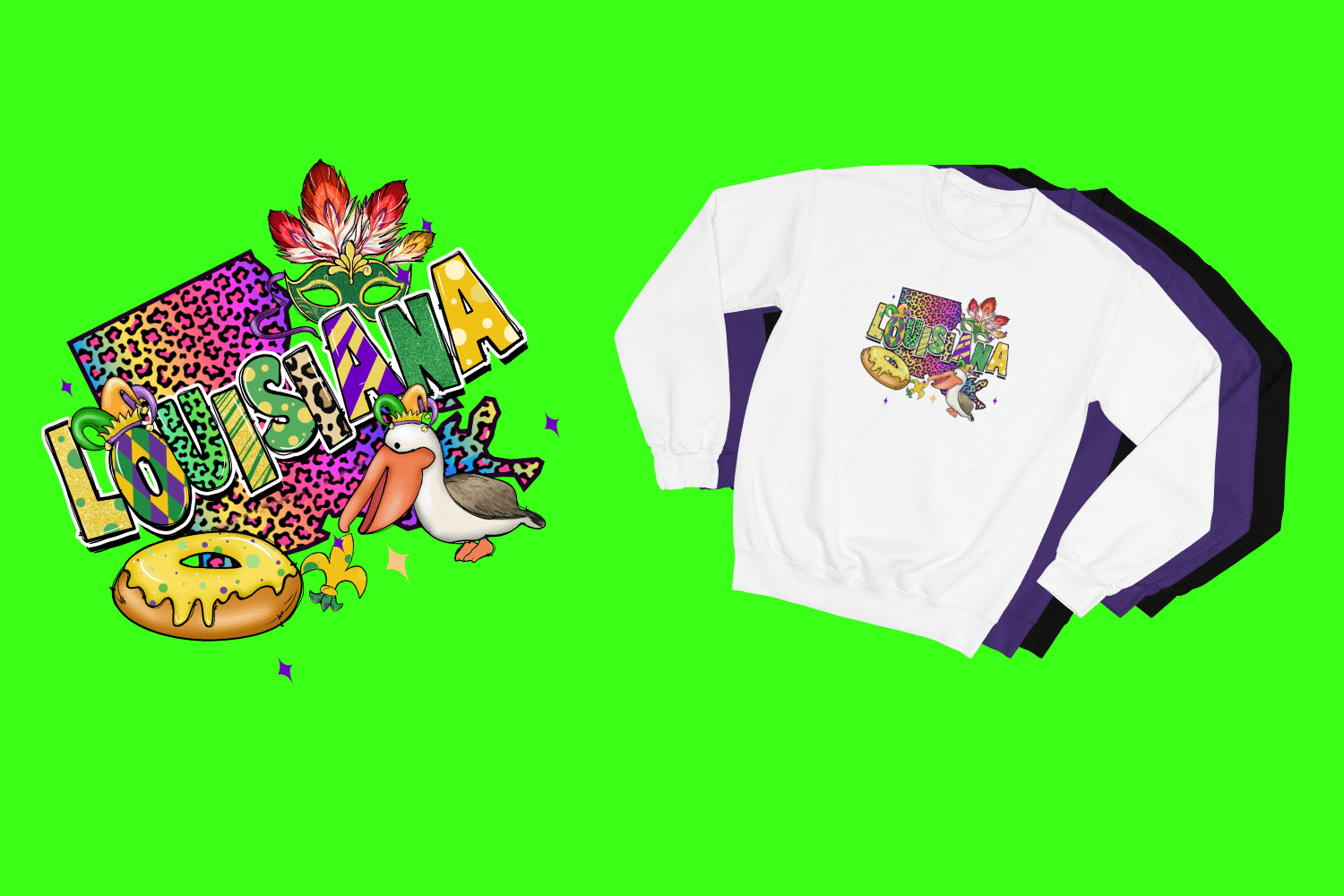 Cozy up in style this Mardi Gras with the Leopard Louisiana Mardi Gras sweatshirt! With a bold and festive design featuring a leopard-patterned Louisiana map, a mask, a king cake, and a crowned pelican, this sweatshirt combines comfort and celebration perfectly.