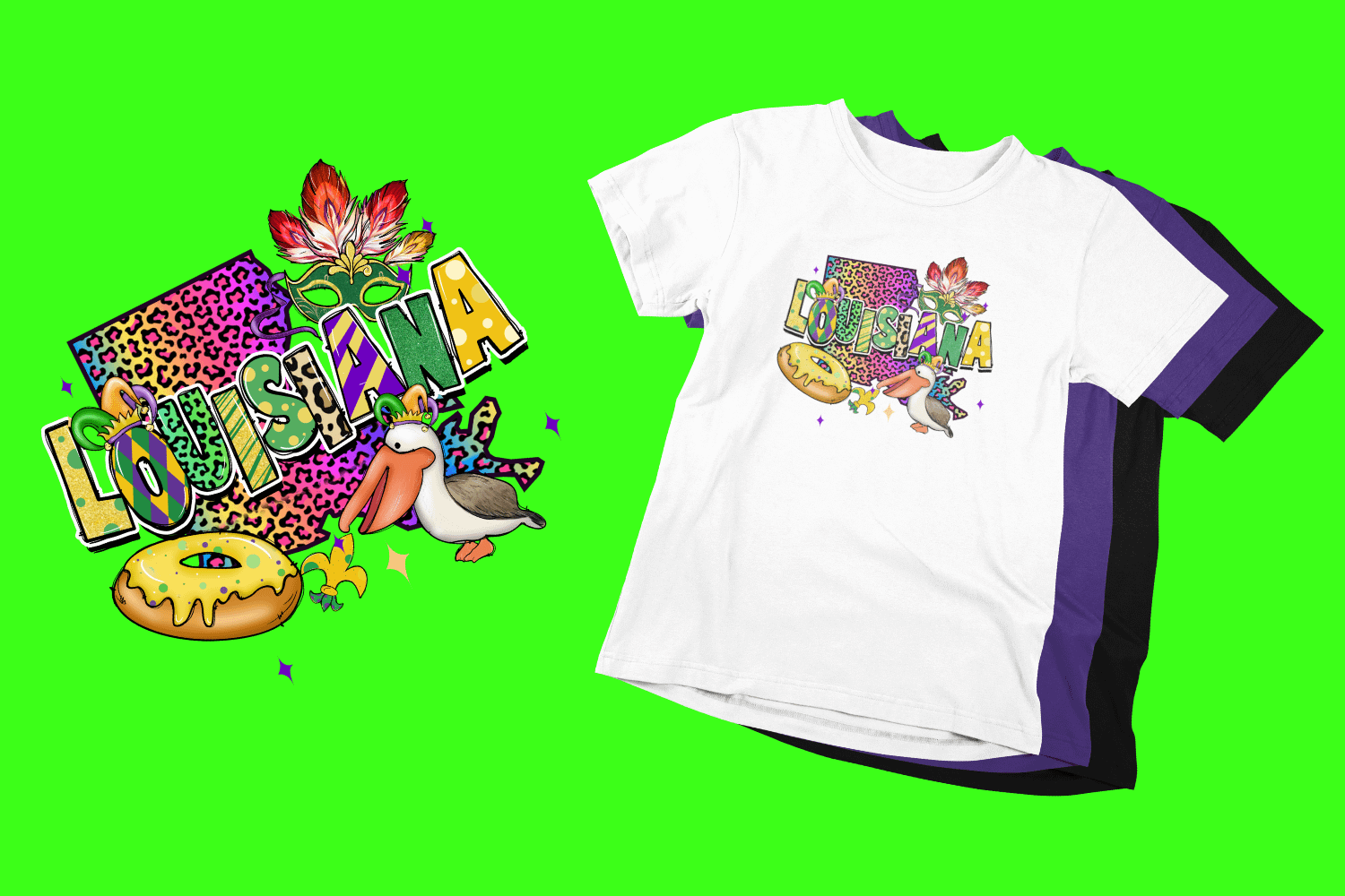 Show off your Louisiana pride this Mardi Gras season with this bold and colorful t-shirt! Featuring a leopard-patterned Louisiana map, a vibrant Mardi Gras mask, and playful icons like a king cake and crowned pelican, this design is perfect for celebrating the spirit of Louisiana in style.