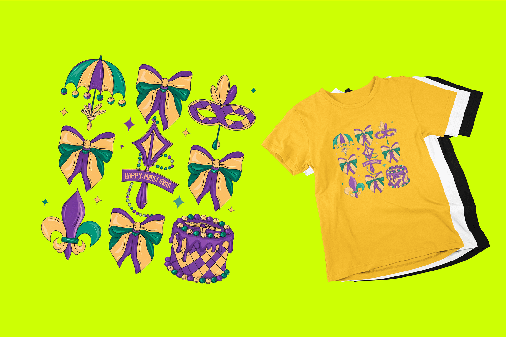 Step into Mardi Gras season with elegance and flair! This t-shirt features a charming collection of coquette bows, a Mardi Gras mask, beads, a festive cake, and classic fleur de lis—all in vibrant purple, green, and gold. Perfect for celebrating in style!