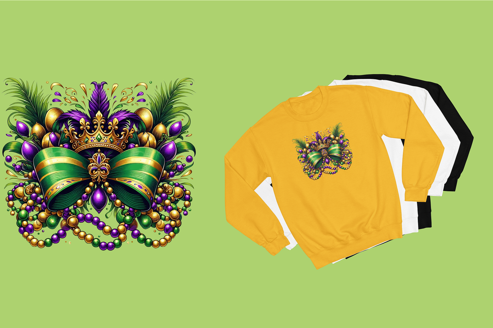 Cozy up this Mardi Gras season with a sweatshirt that exudes regal charm. Featuring a royal crown, intricate feathers, and festive beads, this sweatshirt is perfect for chilly parades or relaxing in style. The vibrant green and gold bow adds a touch of grandeur.