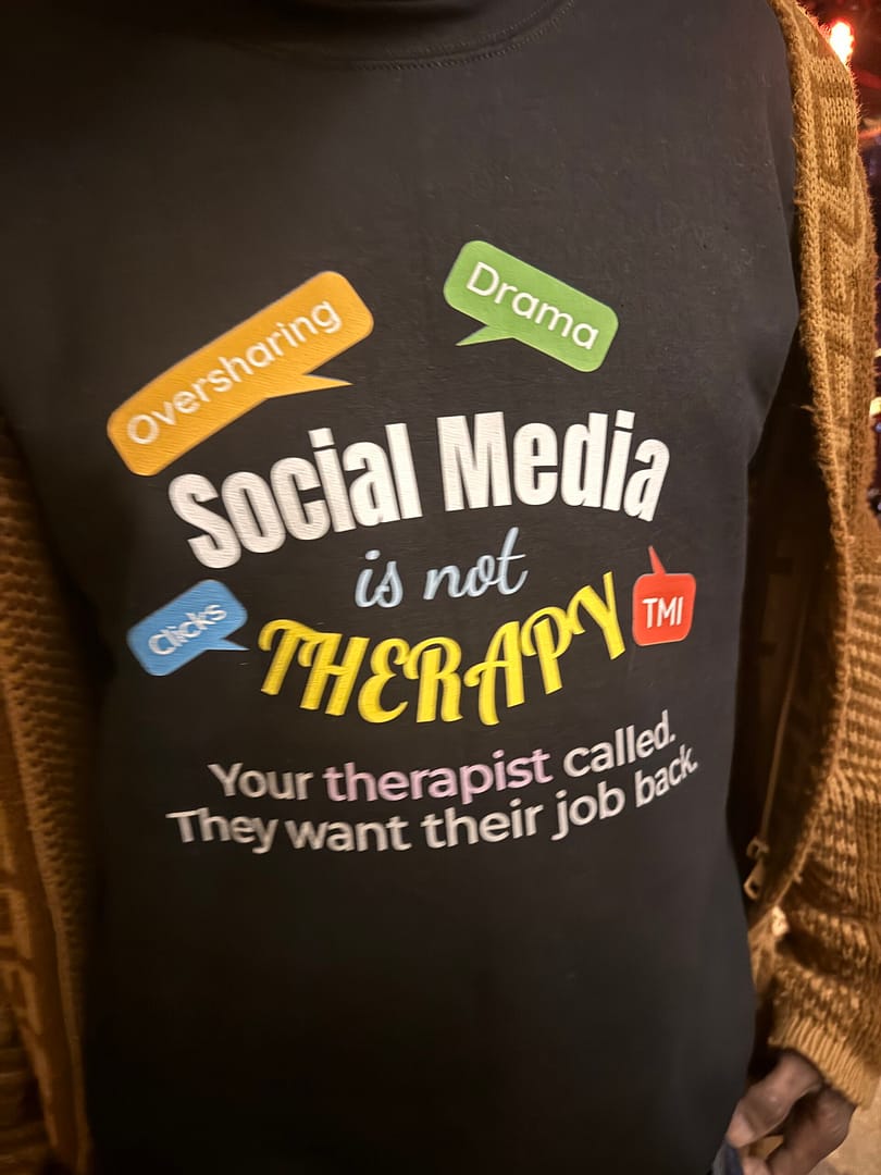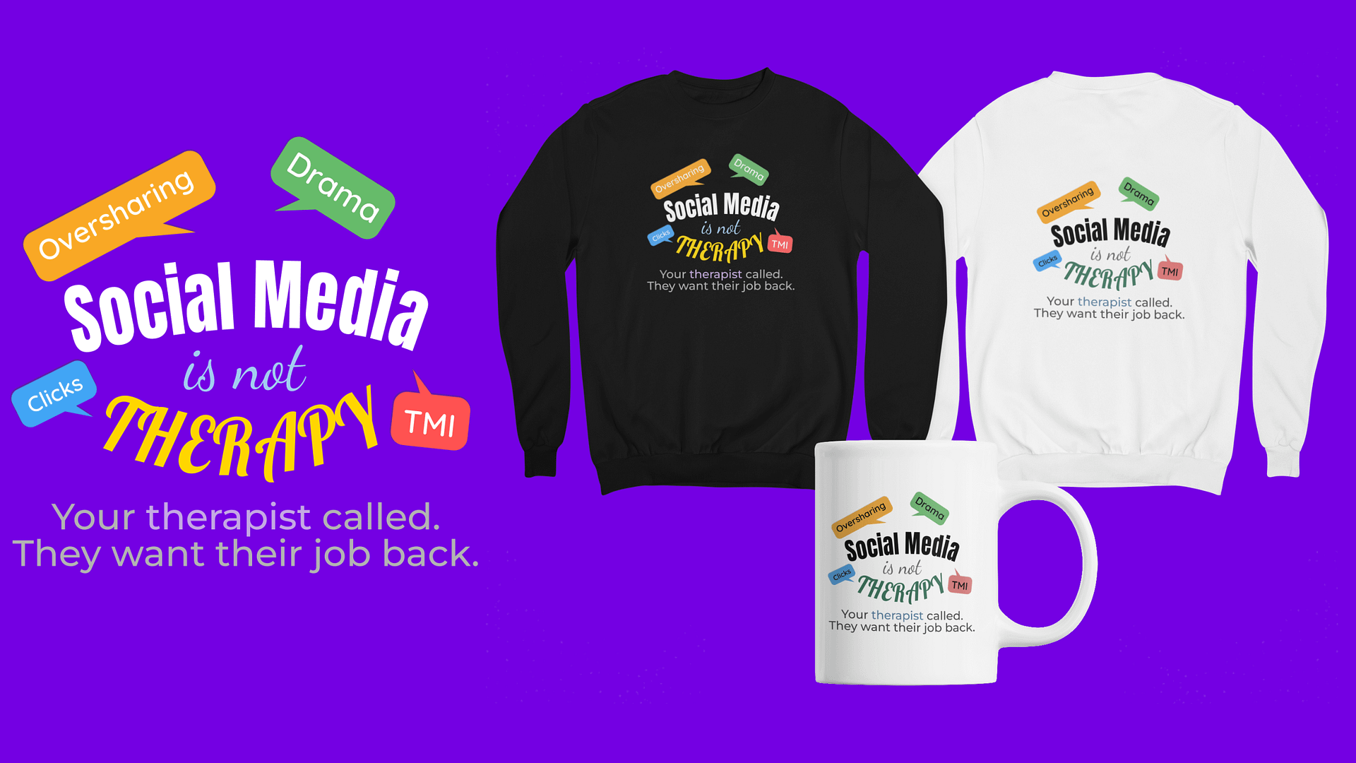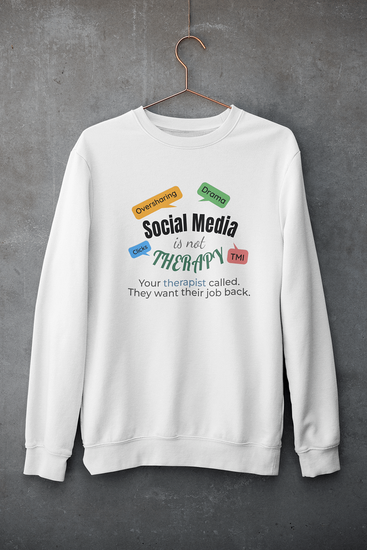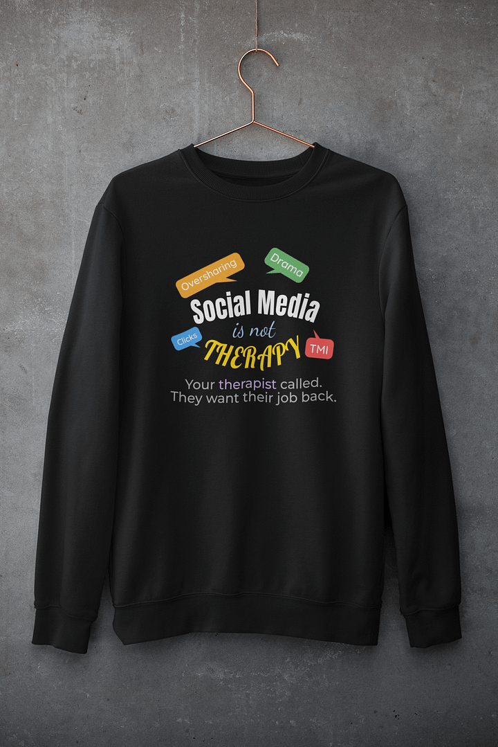 Take a stand for mental health awareness with the “Social Media Is Not Therapy” Sweatshirt—a bold, relatable, and eye-catching design that sparks conversation. Featuring colorful speech bubbles with phrases like Oversharing, Clicks, Drama, and TMI, this sweatshirt serves as a reminder that not everything belongs online.