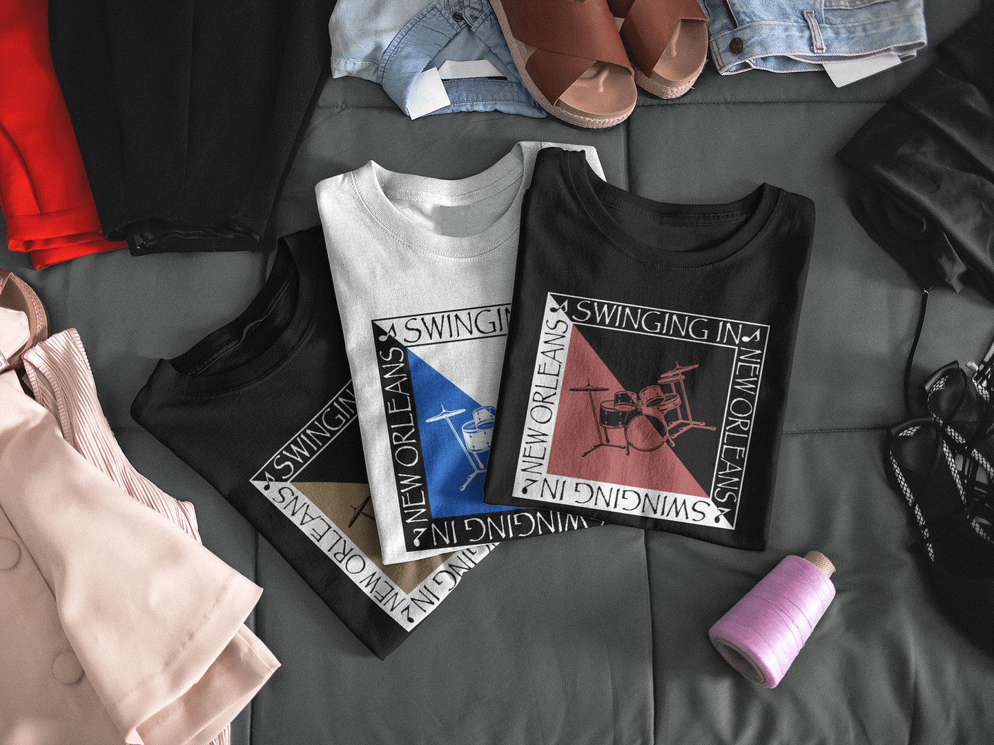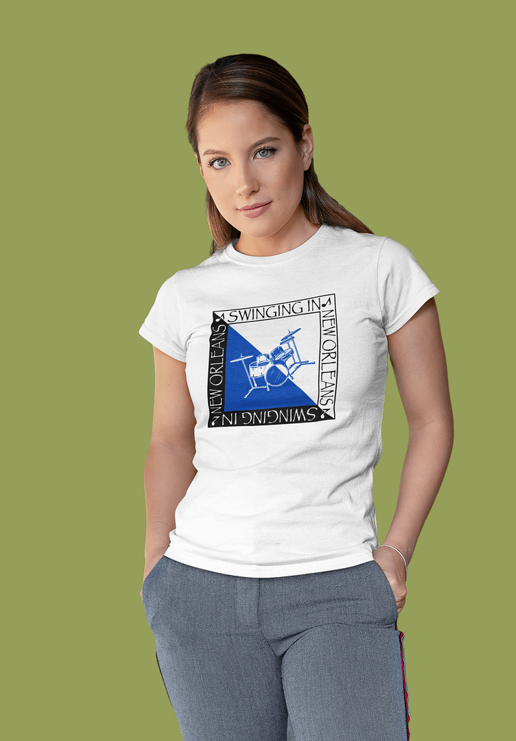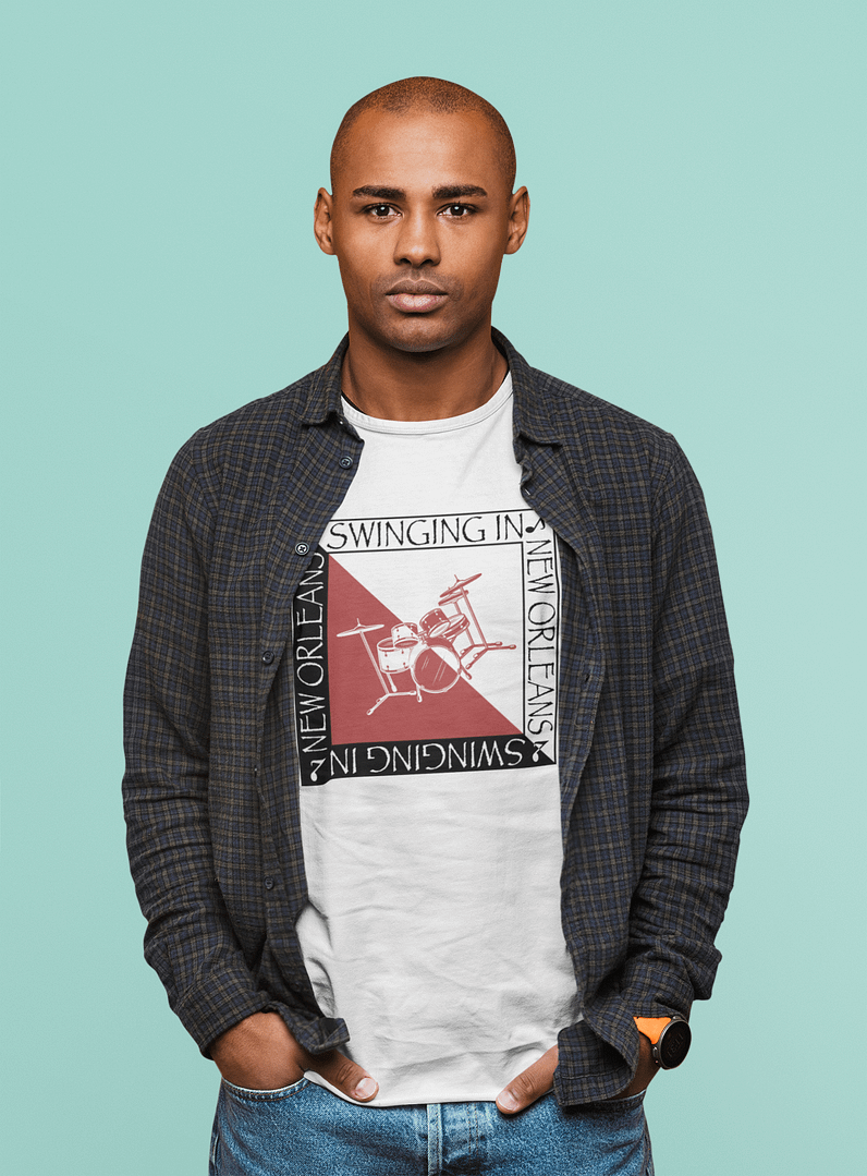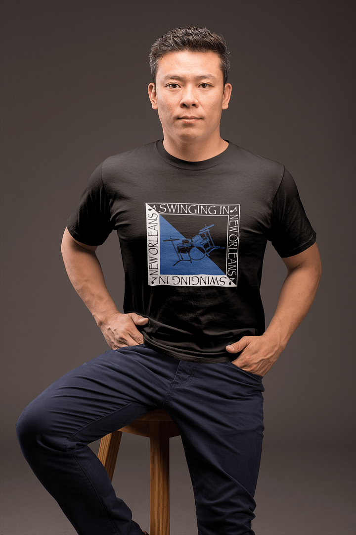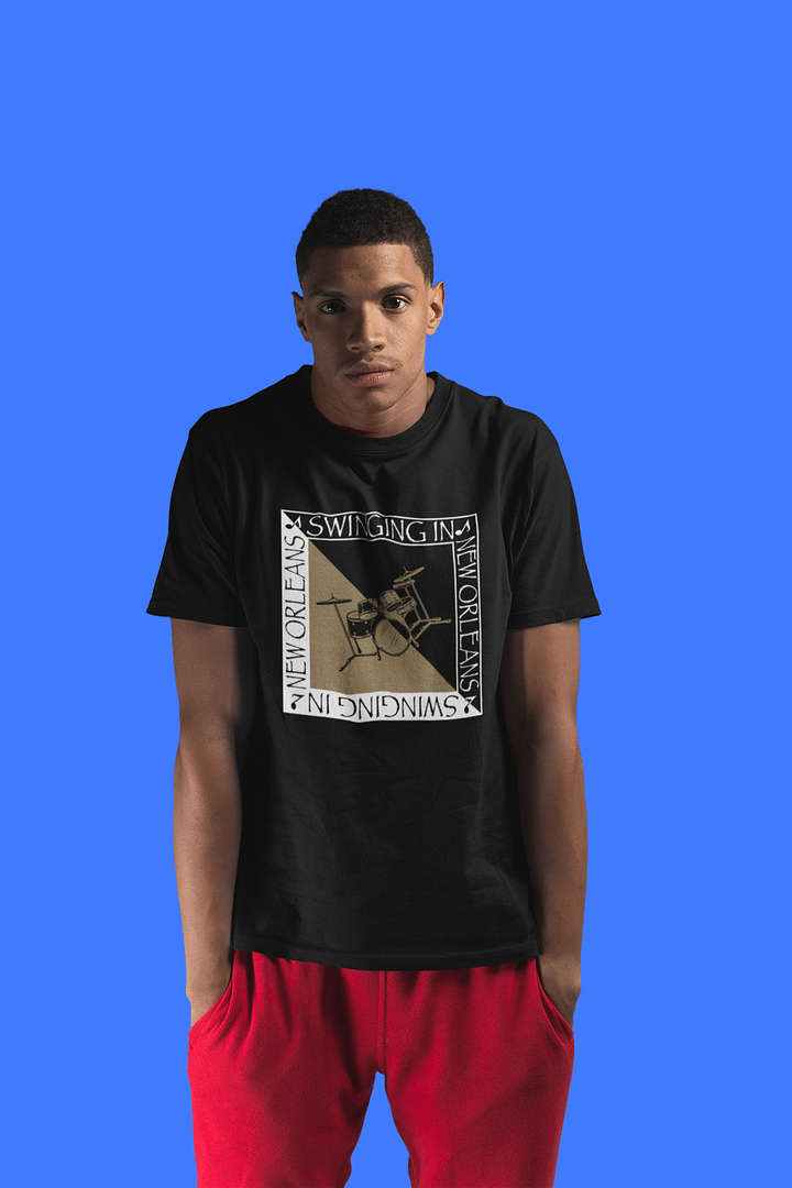 Get into the groove of New Orleans with our Swinging in New Orleans Drum Set T-Shirt. Featuring a dynamic drum set design available in striking red, blue, and gold, this t-shirt brings the rhythm of the Crescent City to life. Choose between classic black or crisp white tees, each made from durable, 100% preshrunk cotton that holds its shape and size wash after wash.